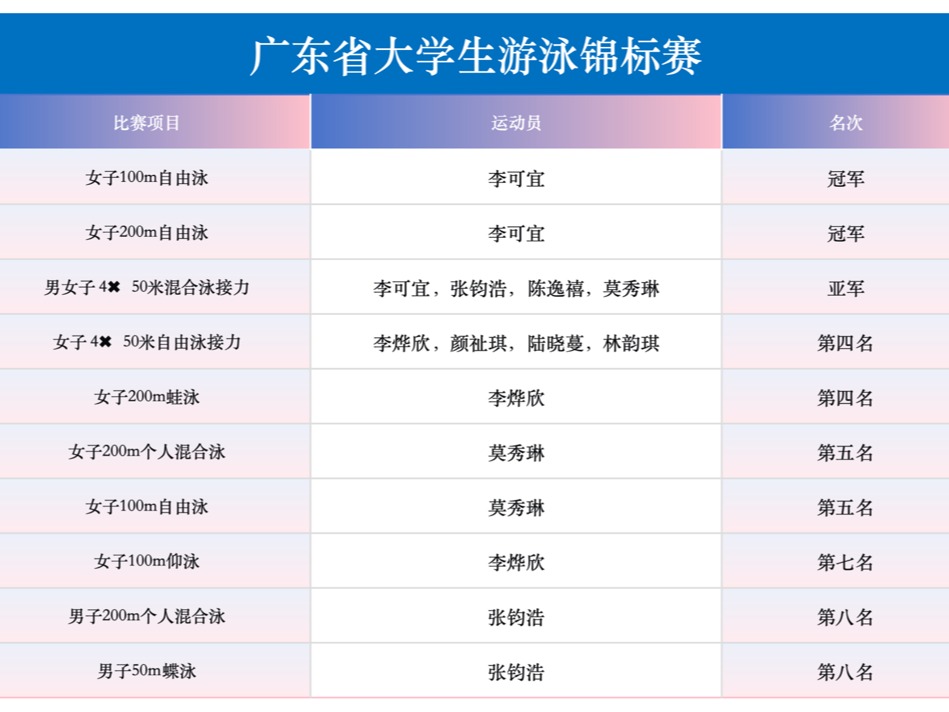 2025年广东省大学生游泳锦标赛于10月10日至13日在华南师范大学成功举办。作为省内高校游泳项目的最高水平赛事,本届比赛汇聚了来自全省71所高校的选手同场竞技,竞争激烈,备受瞩目。