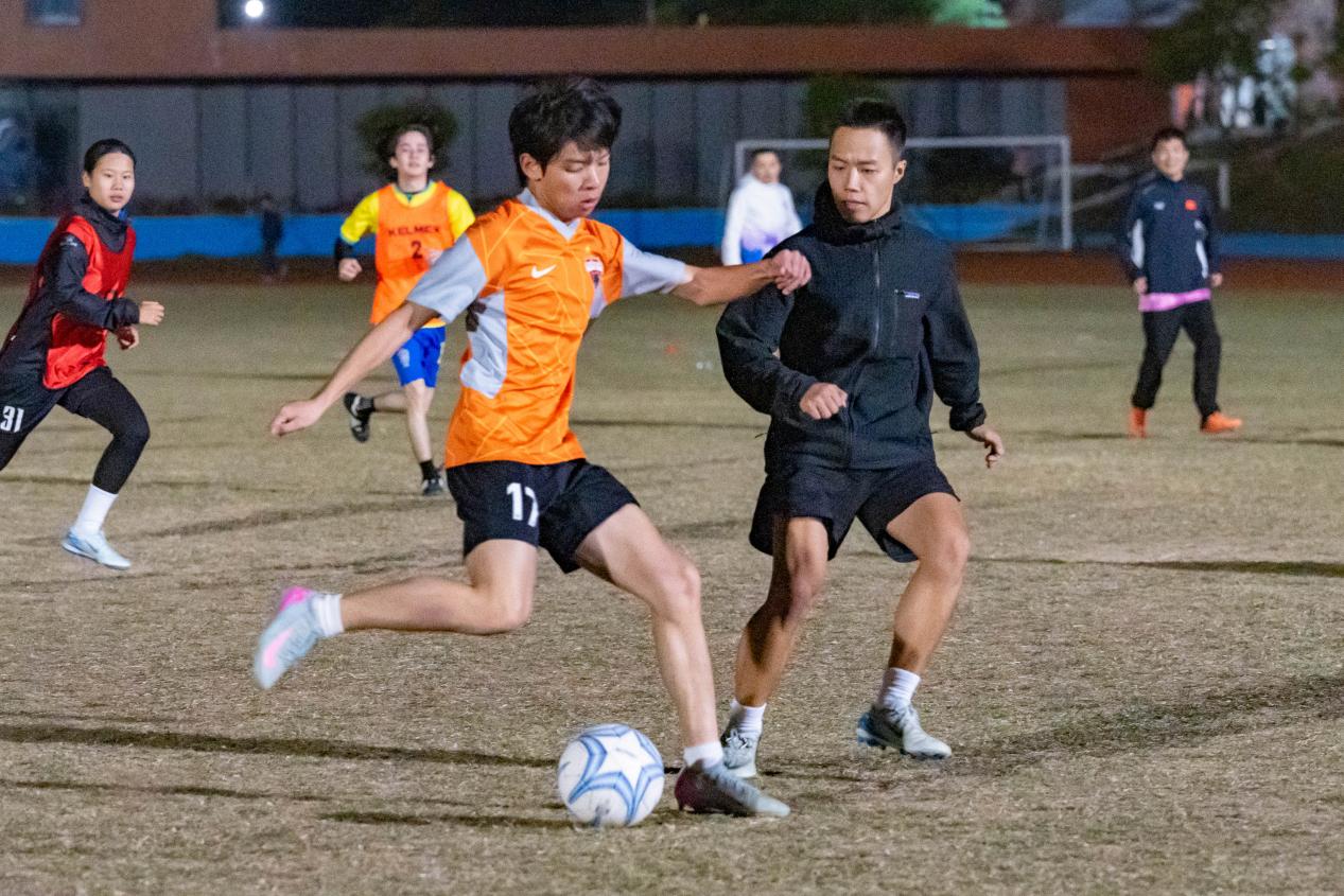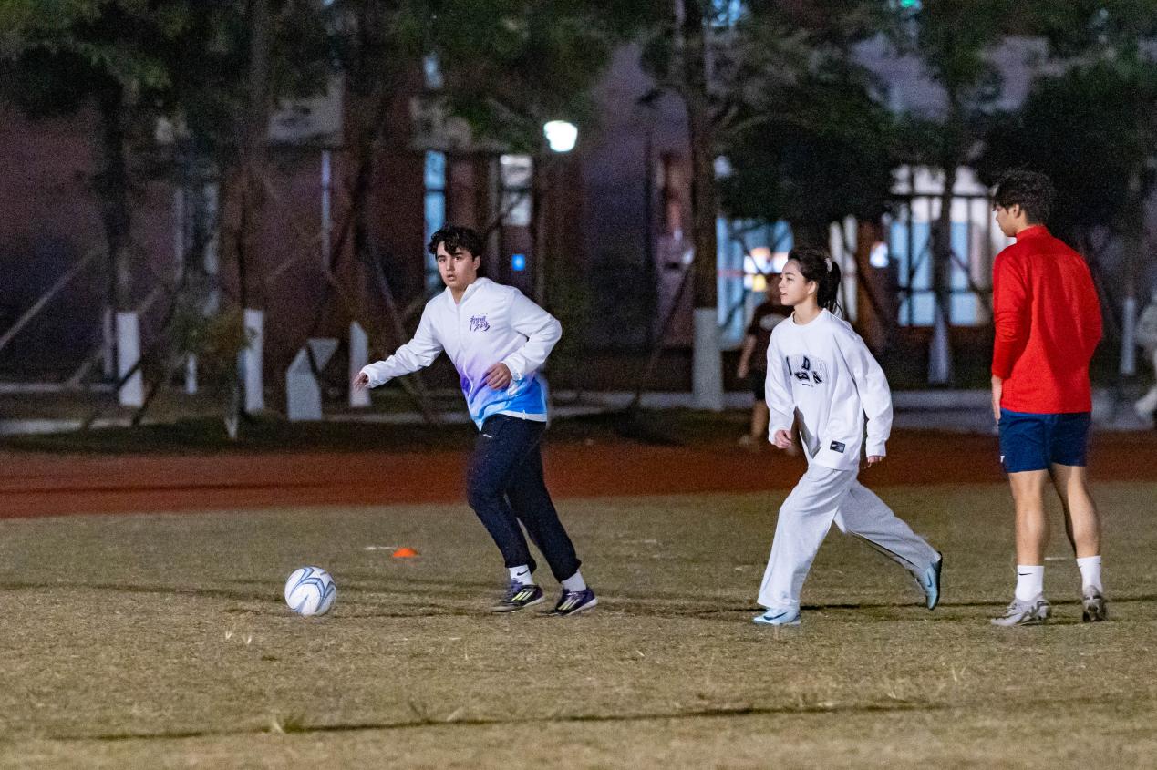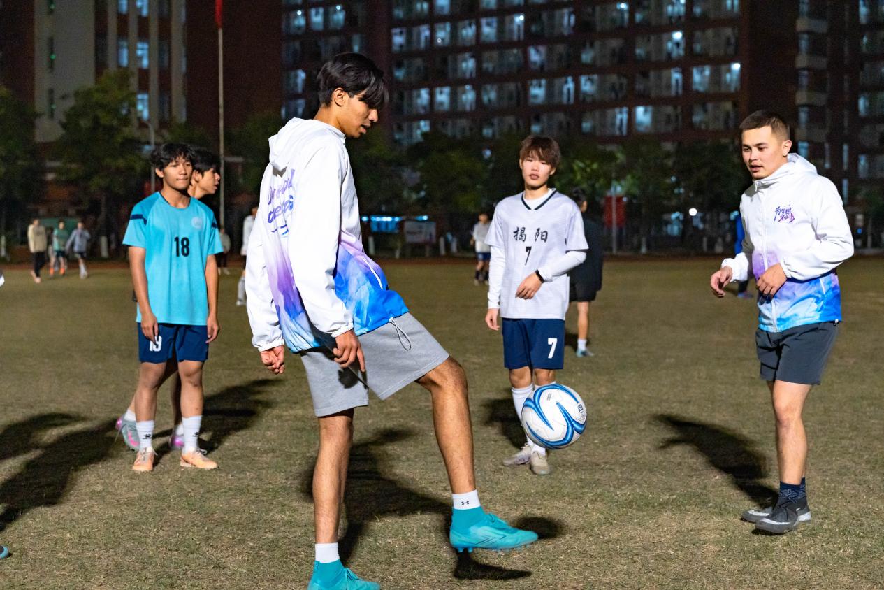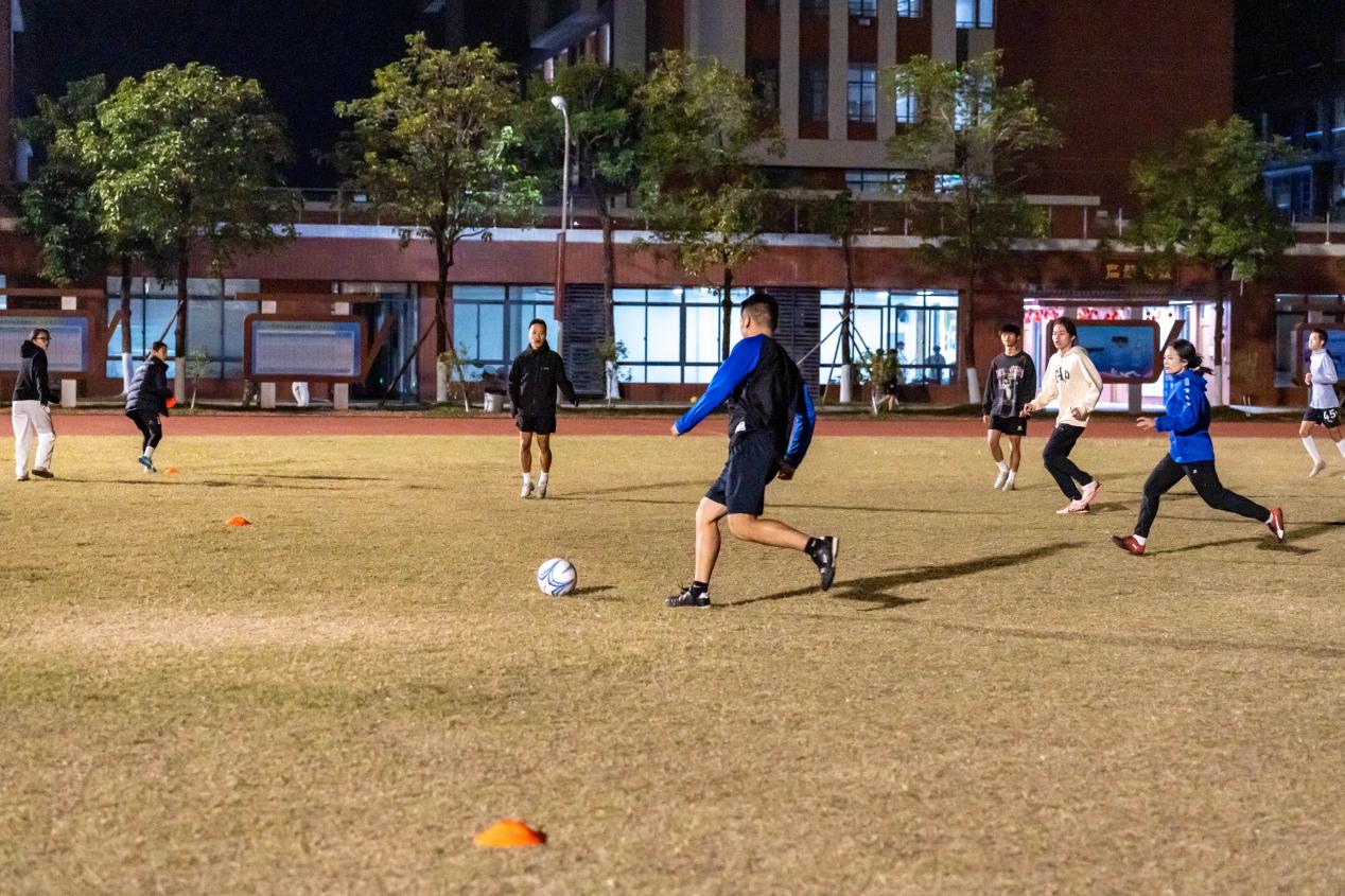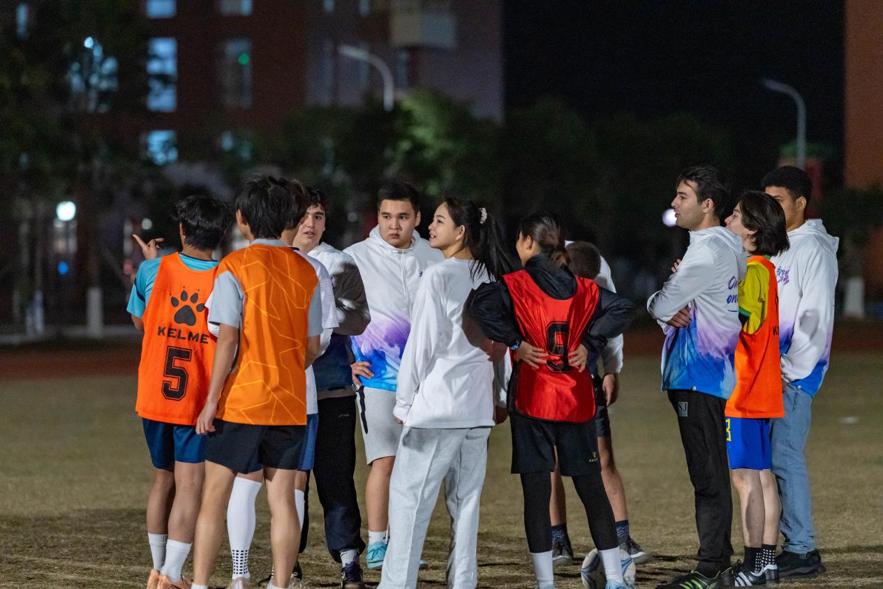 尽管当晚气温偏低,但丝毫没有影响大家的参赛兴致。30 余名师生按组别分成三支队伍,通过轮番对阵的形式切磋球技、传递友谊,让赛场成为中外文化碰撞、师生情谊升温的舞台。