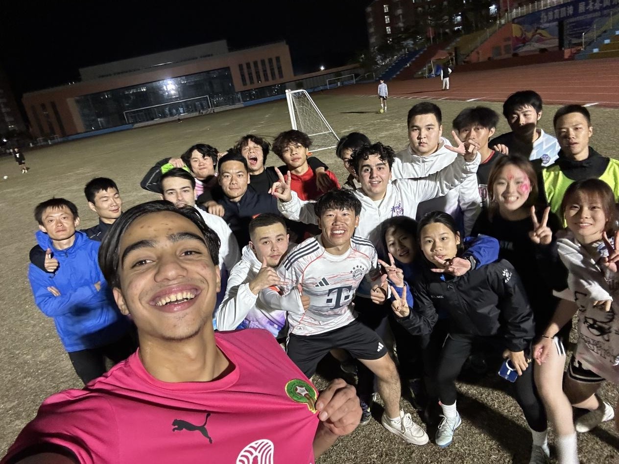 夜幕下,交流赛在欢声笑语中落下帷幕。中外师生们纷纷握手致意、合影留念,定格这段因足球结缘的美好时光。此次活动是本学期足球社团举办的第三次足球交流活动,“以球会友、以球促学” 的氛围在校园内持续升温。从初次见面时的拘谨,到赛后用中英双语畅聊的融洽,足球让中外师生打破语言壁垒,在运动中加深了解,更激发了彼此学习语言的兴趣。