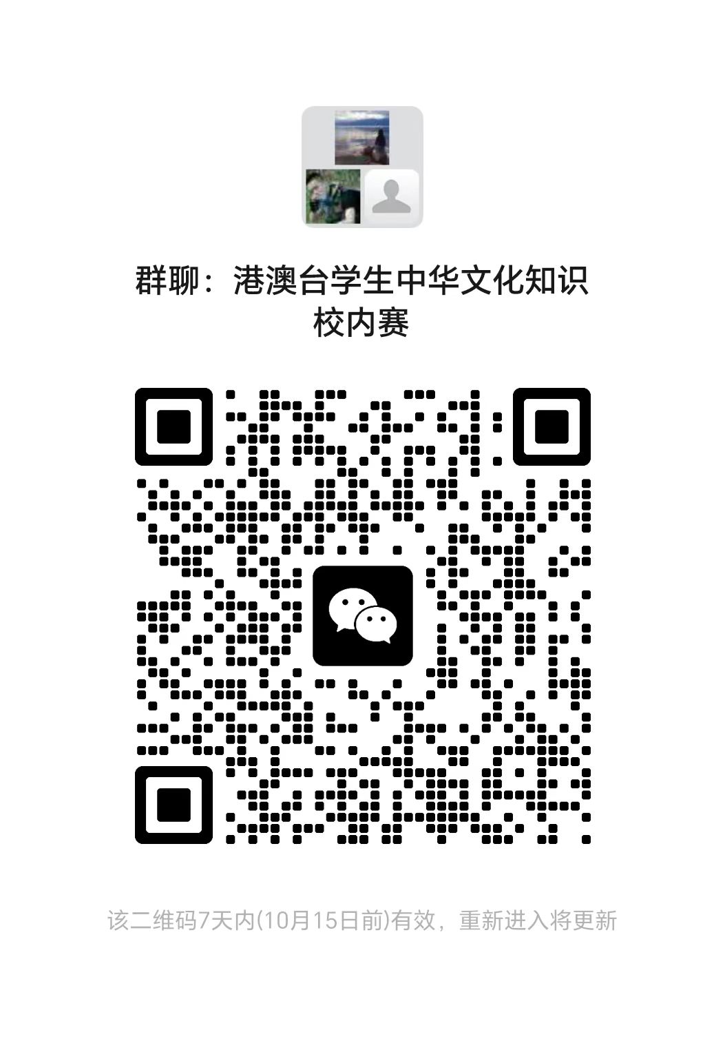 2.加入中华文化知识大赛校内赛微信群。请务必加群,负责老师将在群里发布题库,通知具体事宜。